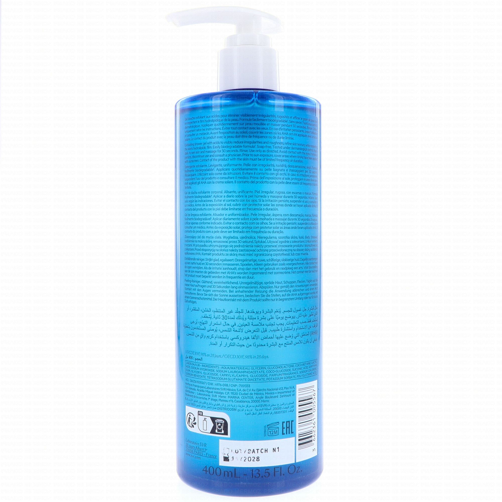 Ce gel douche exfoliant aux acides (AHA, PHA, acide succinique) élimine visiblement les irrégularités, rugosités et affine le grain de peau. L'acide polyglutamique et les boosters d'aquaporines hydratent et renforcent la barrière cutanée pour un meilleur respect du film hydrolipidique de la peau. Dès la 1ère utilisation2, la peau est plus belle, plus lisse, plus uniforme. Jour après jour, le grain de peau est affiné et les irrégularités sont éliminées.