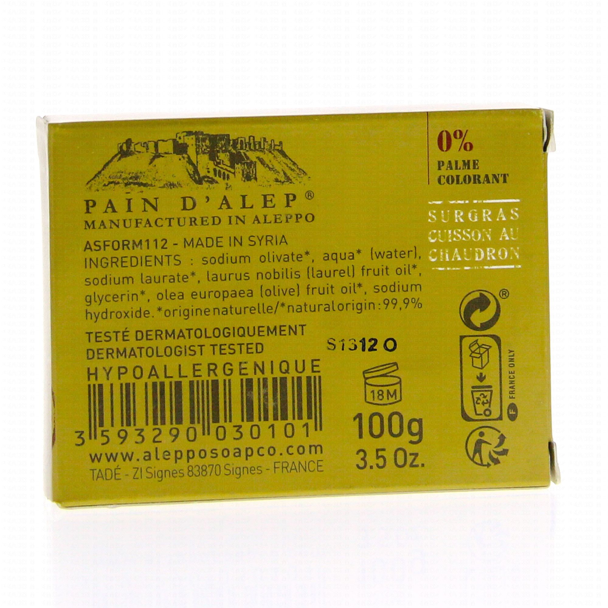 Cuit au chaudron en discontinu selon la méthode artisanale ancestrale et ensuite séché à l'air libre pendant 9 mois, le savon d'Alep à l'huile d'olive et au laurier est exclusivement végétal. Il est à base d'huile d'olive additionnée en cours de saponification et d'huile de laurier noble.