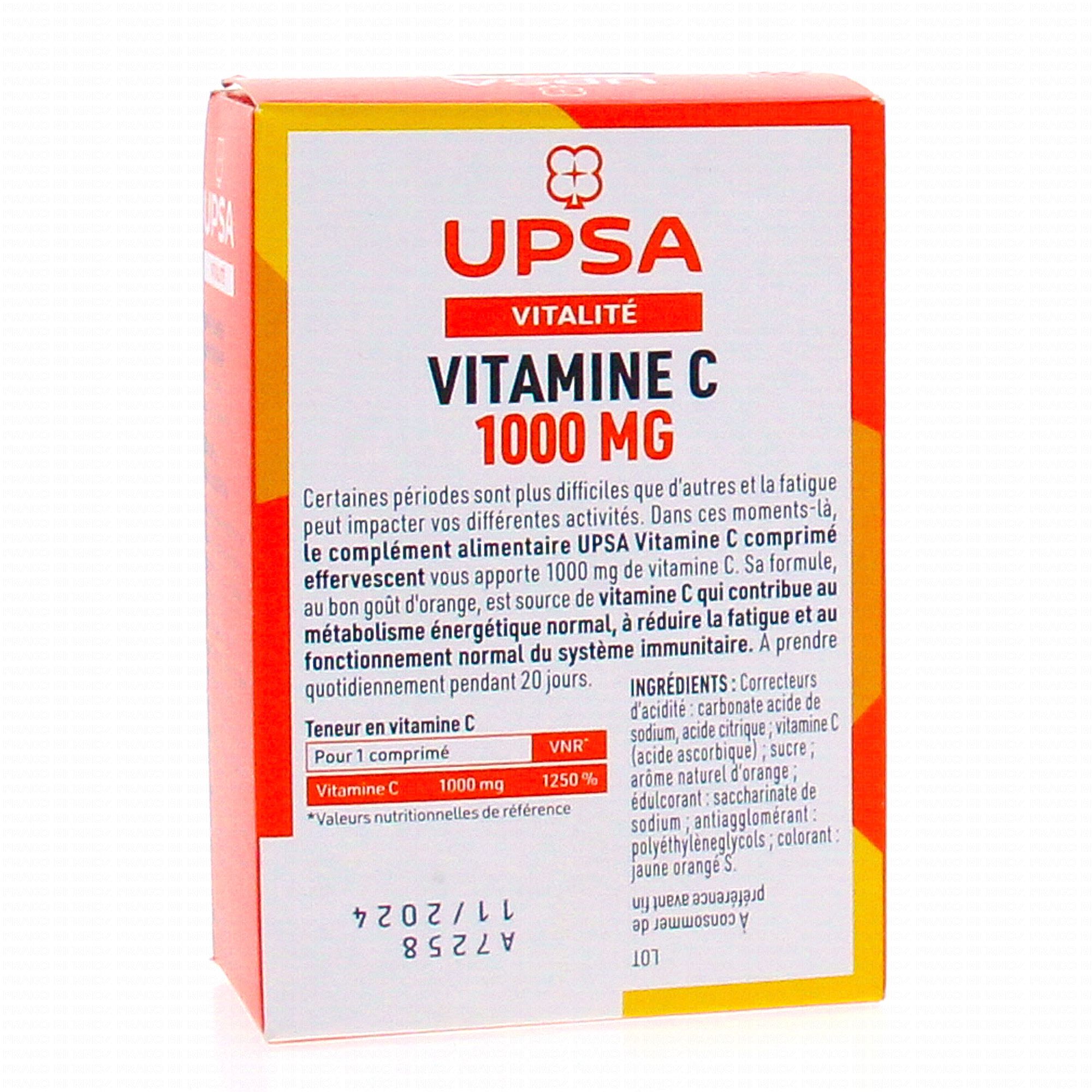 UPSA Vitamine C 1000mg x20 Comprimés effervescents est un complément alimentaire qui contribue à réduire la fatigue et à renforcer le système immunitaire grâce à la présence de vitamine C.