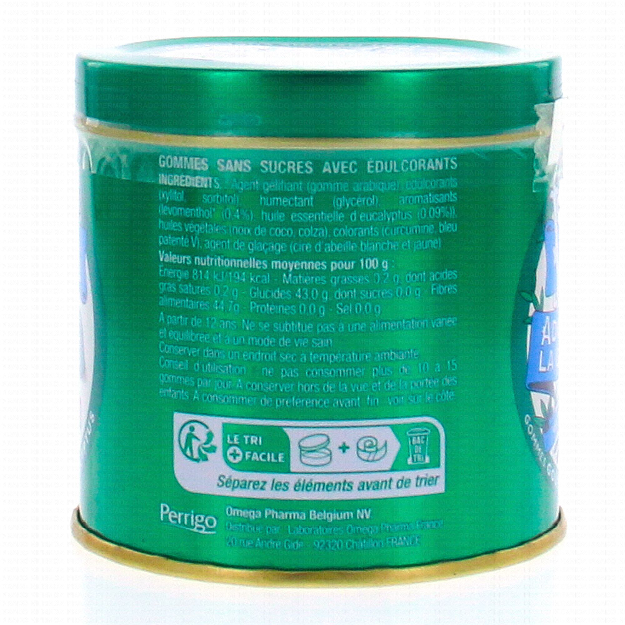 Gomme Arabique, Edulcorants : Xylitol et Sorbitol, Glycérol, Aromatisants : Menthol (0. 4 %) et Huile Essentielle d'Eucalyptus (0. 08 %), Colorants : Curcuma Bleu Patenté V.