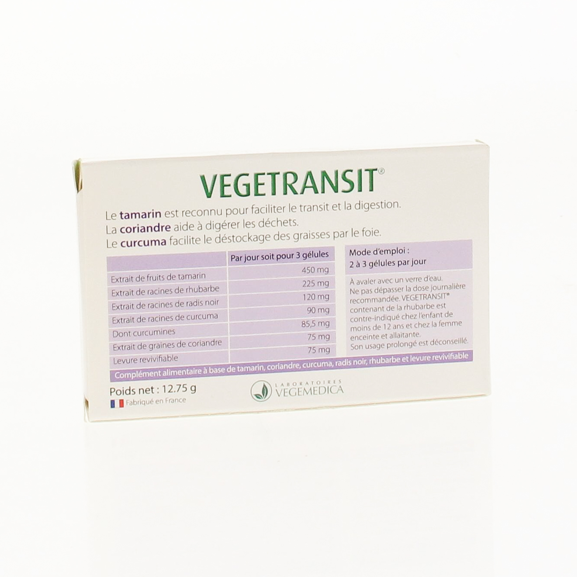 Ingrédients : extrait de fruit de tamarin (tamarindus indica L.), extrait de racines de rhubarbe officinale (rheum officinle Baill.) et de rhubarbe palmée (rheum palmatum L.), tunique d'origine végétale : hydroxypropylméthylcellulose, extrait de racines de radis noir (raphanus sativus L), extrait de racines de curcuma (curcuma longa L) à 95% de curcumines, extrait de graines de coriandre (coriandrum sativum L.), levure revivifiable (saccharomyces cerevisae), anti-agglomérant : sels de magnésium d'acides gras.