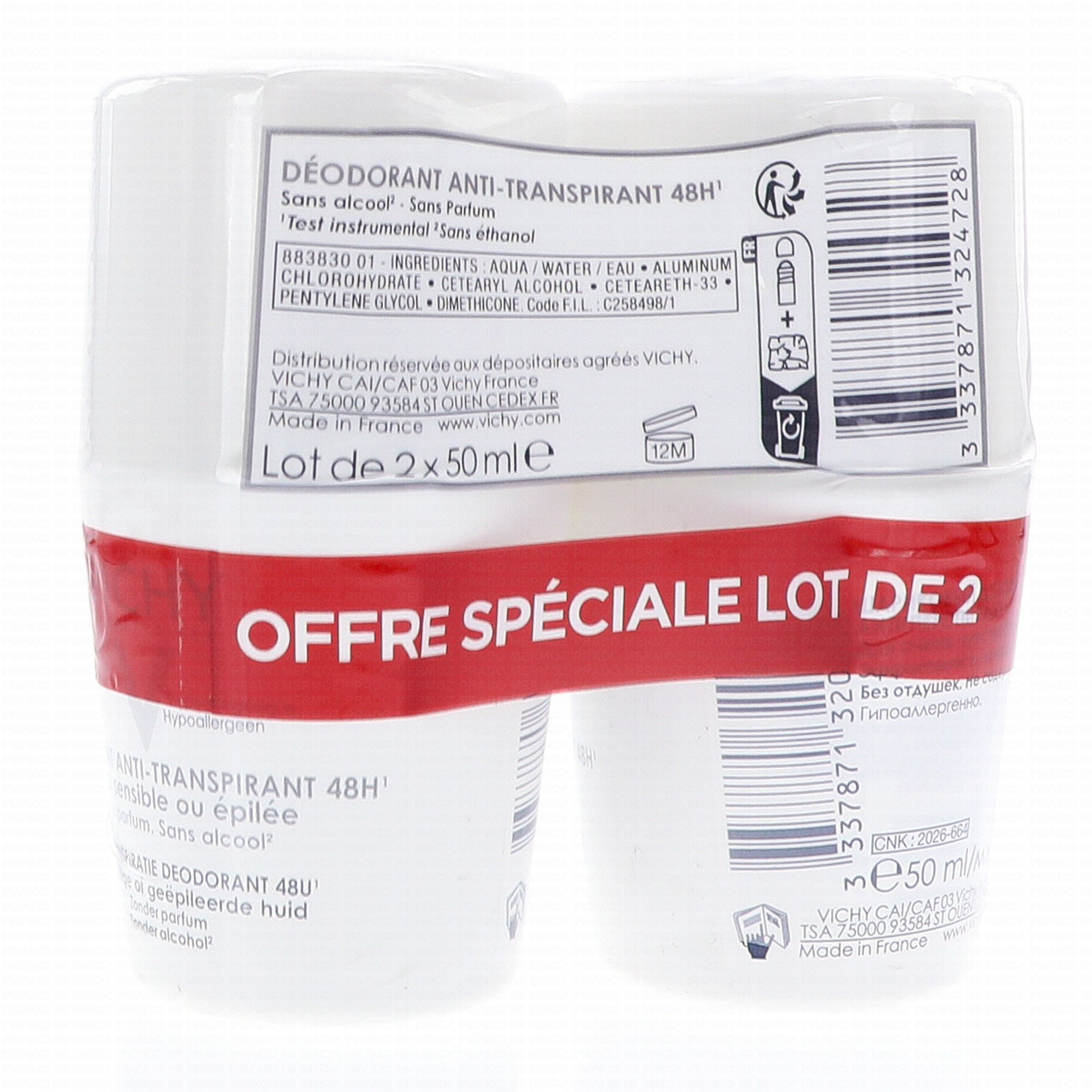 VICHY Déodorant anti-transpirant 48h peau sensible ou épilée lot de 2 roll'ons x 50ml