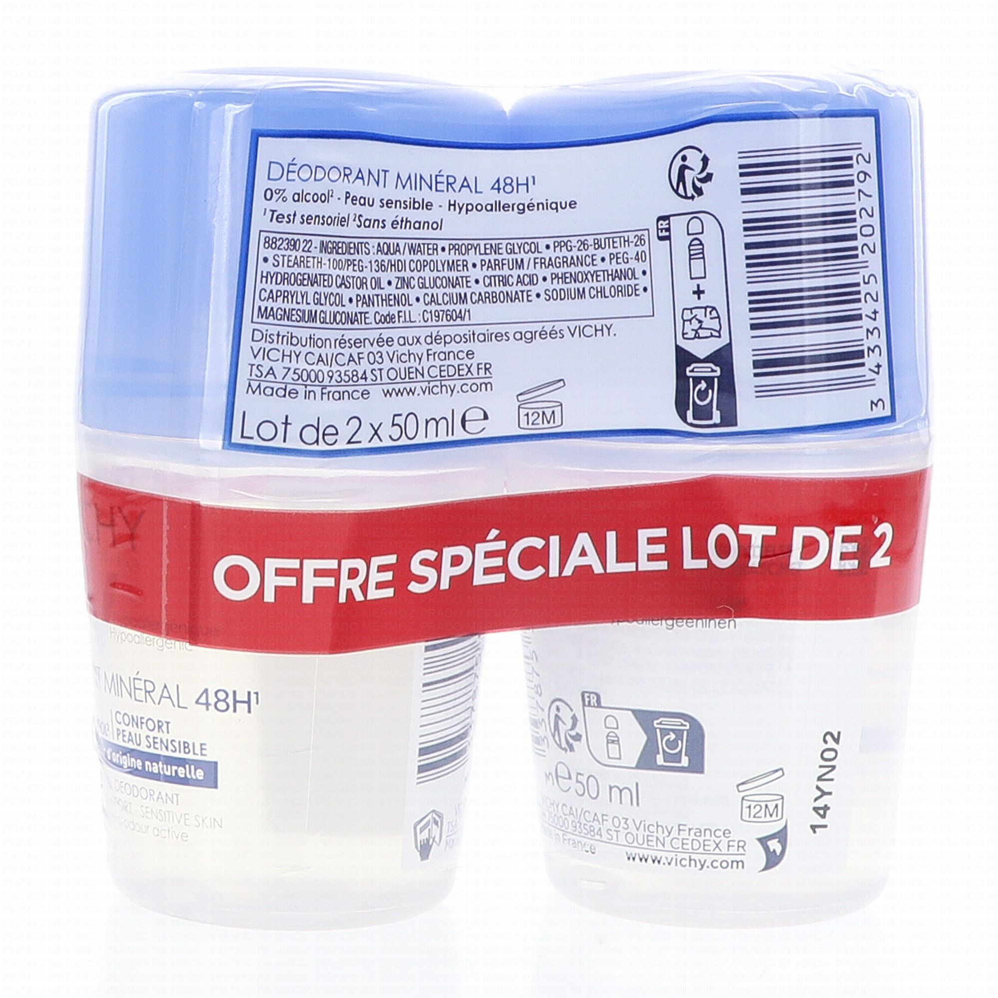 VICHY Déodorant minéral 48h sans alcool roll-on lot de 2 x 50 ml