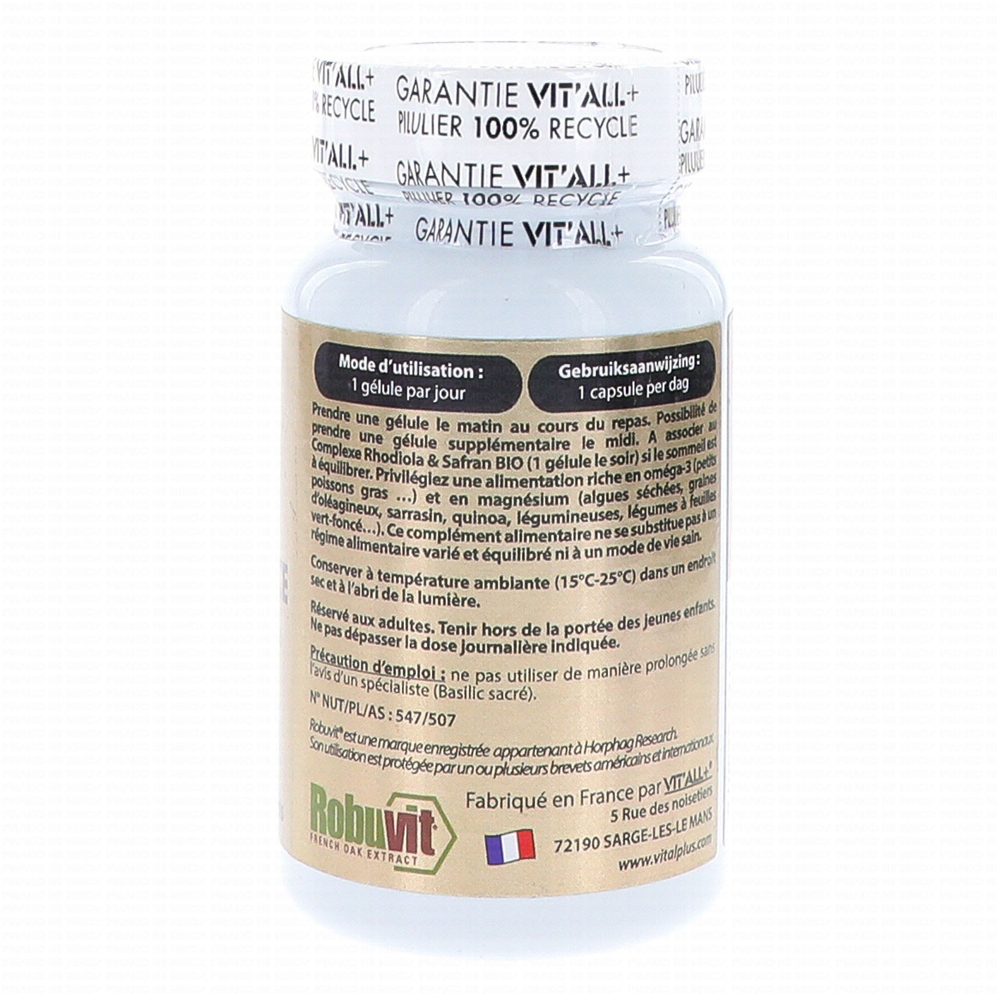 Ingrédients pour 2 gélules: Robuvit® Chêne (Quercus robur) - bois - Extrait standardisé à 40% de polyphénols - 50:1 - Origine France 150 mg Basilic sacré (Ocimum sanctum) - feuille- Extrait standardisé à 2,5% acide ursolique - 20:1 100 mg L-Taurine 75 mg Eleuthérocoque (Eleutherococcus senticosus) - racine - Extrait standardisé à 0.8 % d'éleuthérosides - 8:1 50 mg Vitamine B3 (Nicotinamide) - AR¹ : 100% 16 mg Vitamine B6 (Pyridoxal 5-phosphate) - AR¹ : 428% 6 mg Vitamine B1 (Thiamine mononitrate) - AR¹ : 363% 4 mg ¹(apport de référence) Autre(s) ingrédient(s) : Hypromellose*