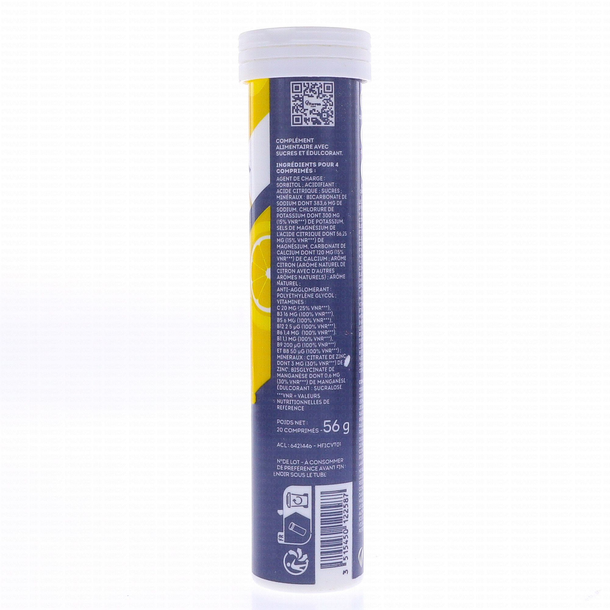 Agent de charge : sorbitol ; acidifiant : acide citrique ; minéraux : bicarbonate de sodium, sels de magnésium de l'acide citrique, chlorure de potassium, carbonate de calcium ; arôme citron / arôme naturel ; vitamines : C, B3, B5, B12, B6, B1, B9 et B8 ; minéraux : citrate de zinc, bisglycinate de manganèse ; édulcorant : sucralose ; anti-agglomérant : polyéthylène glycol.