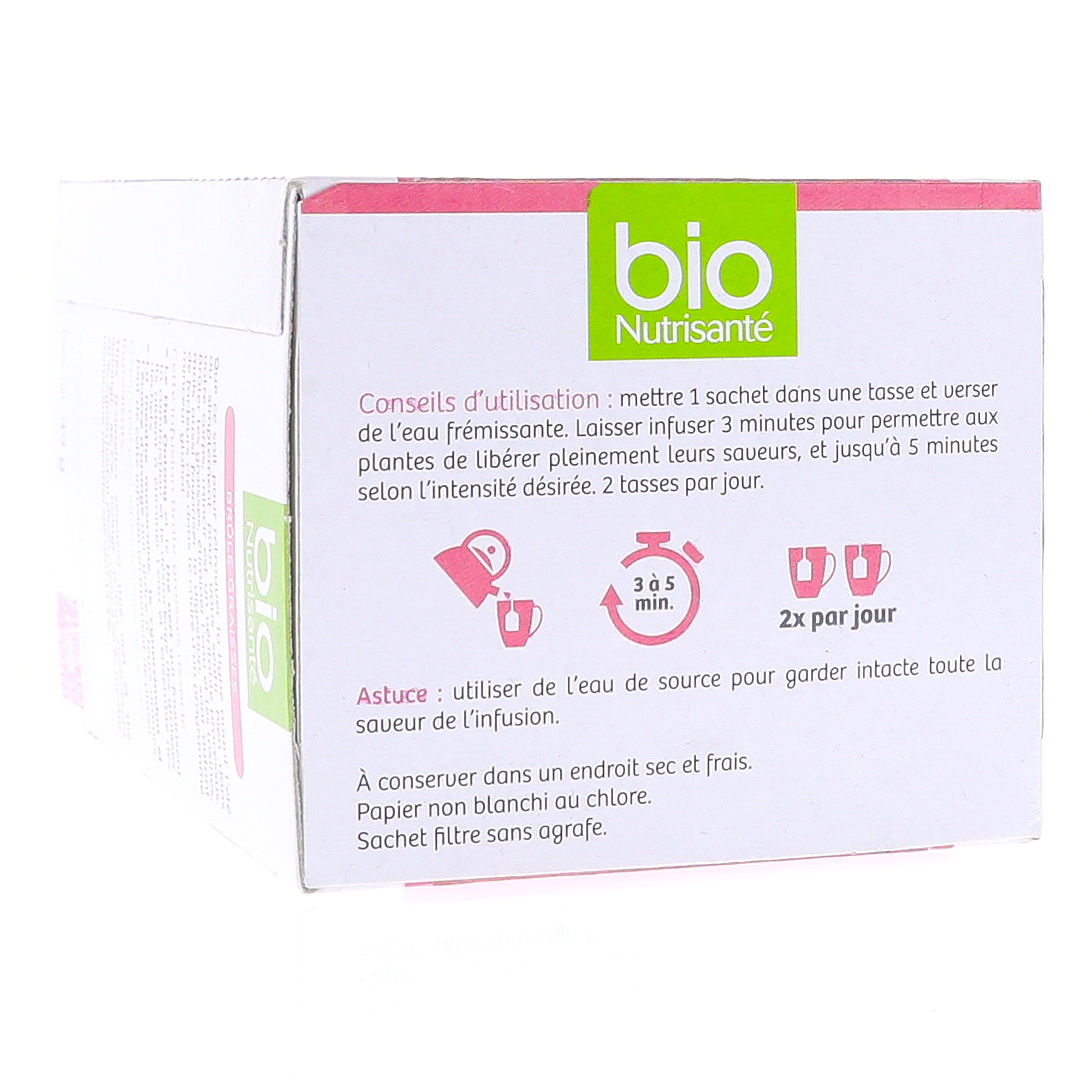 Les infusions Bio Nutrisante sont à 100% à base naturelle. Naturellement aromatisée au thé Oolong, à la menthe marocaine et au cynorhodon, l'infusion brûle-graisse favorise la combustion et le destockage des graisses tout en améliorant le tonus général de l'organisme. Grâce à sa composition enrichie en thé vert, cette infusion garantit une élimination d'eau de l'organisme. Brûle-graisse. Drainage. Destockage. Minceur.