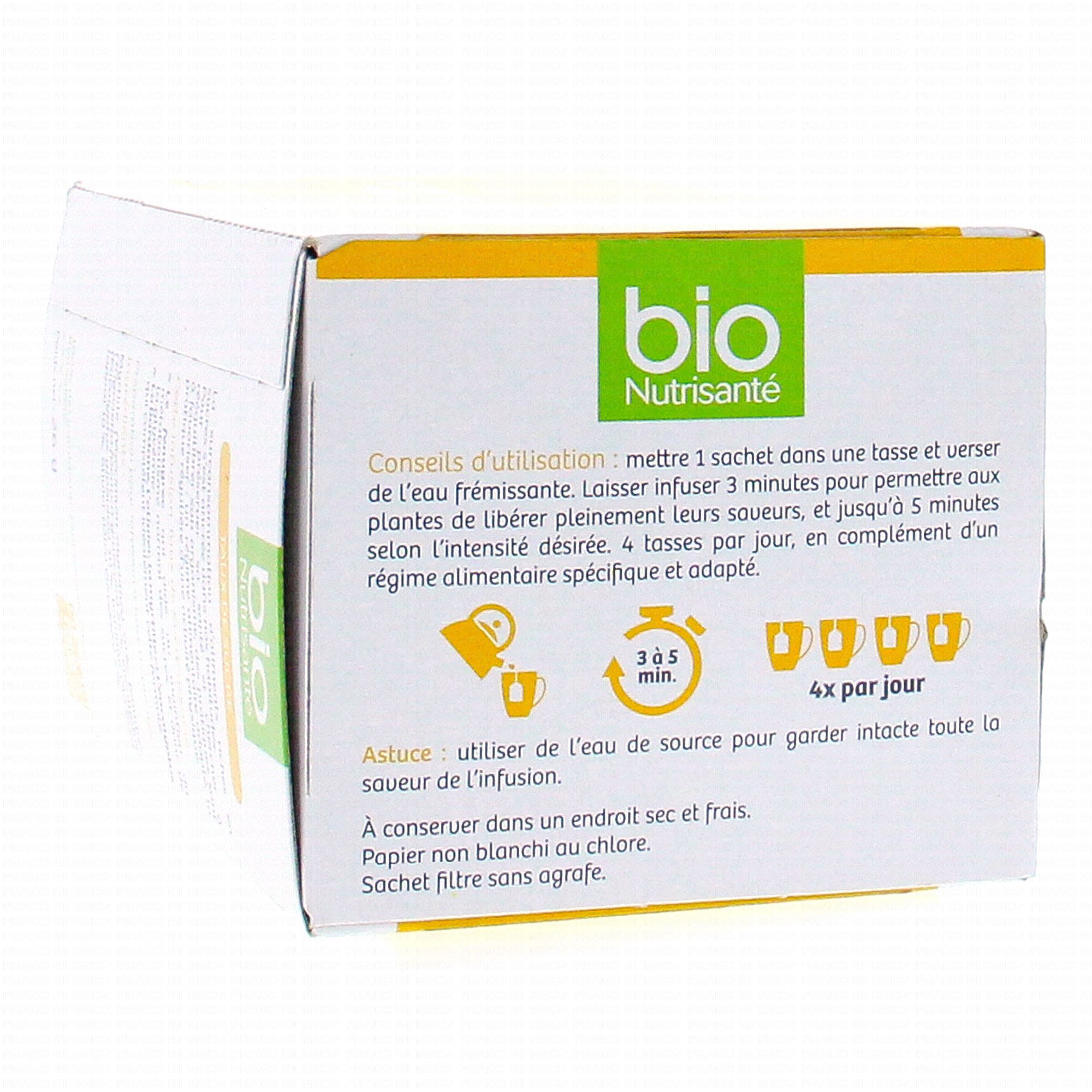 Les infusions Bio Nutrisante sont à 100% à base naturelle. La myrtille, la bardane et l'eucalyptus régulent le taux de sucre dans le sang, le fenugrec diminue le taux de mauvaises graisses, l'olivier favorise une bonne circulation sanguine.