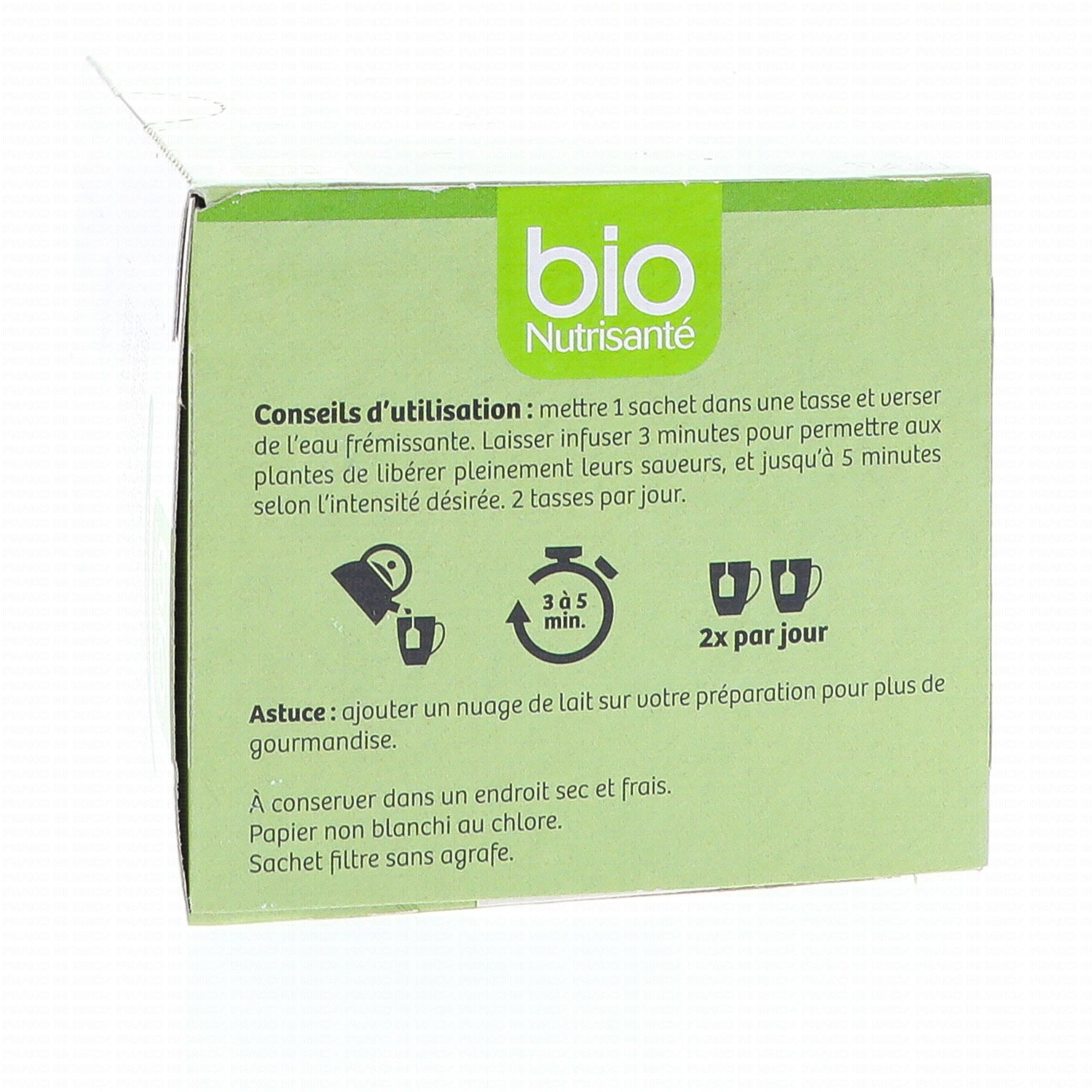 Plonger 1 sachet dans 200 ml d'eau frémissante et laisser infuser 3 minutes pour une saveur douce, ou jusqu'à 5 minutes pour un goût plus intense. À déguster 2 fois par jour, idéalement le matin et en début d'après-midi. Pour une version latte, ajouter du lait végétal ou animal après infusion.