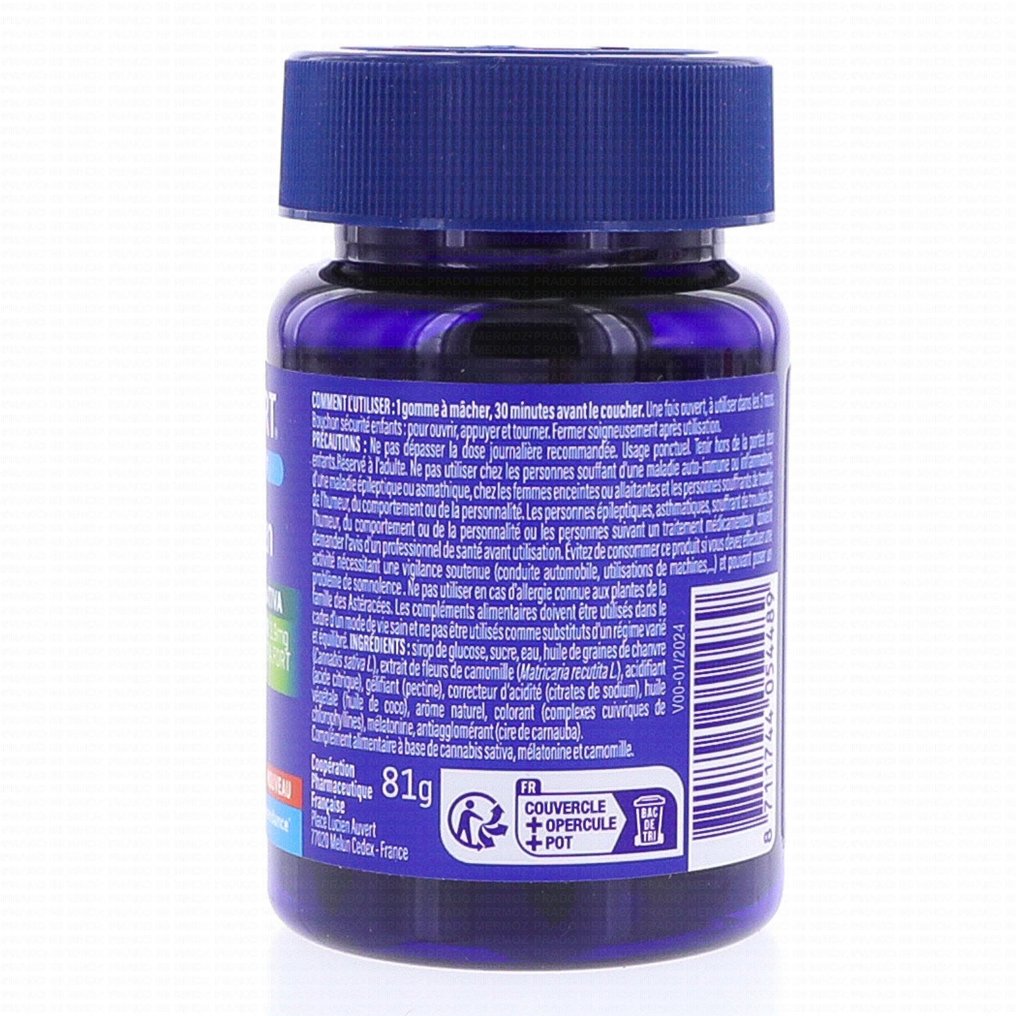 Ingrédients : sirop de glucose, sucre, eau, huile de graines de cannabis (Cannabis sativa L.), extrait de camomille (Matricaria recutita L.), acide (acide citrique), agent gélifiant (pectines), régulateur d'acidité (citrates de sodium), huile végétale (noix de coco), arôme naturel, colorant (complexe cuivre-chlorophylles), mélatonine, agent de glaçage (cire de carnauba).